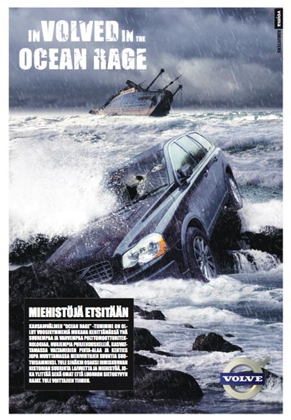 Ocean rage. Volvon mainosta parodoivassa vastamainoksessa seikkailee Volve-auto.